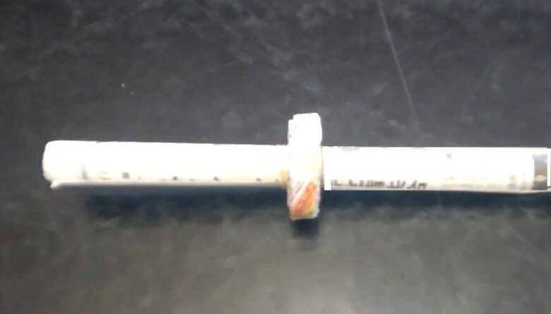 2本の棒を潰しながら棒にきつく巻きつけてサイズを測ります。