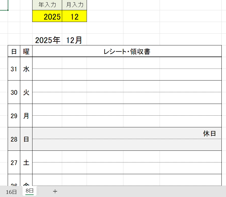 そこでカレンダーのエクセルシートを改造してレシートを張るための用紙を書いてみました。