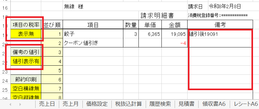 赤い枠の黄色いセルの有無によって税率や値引きの補足情報の表示を切り替えできます。