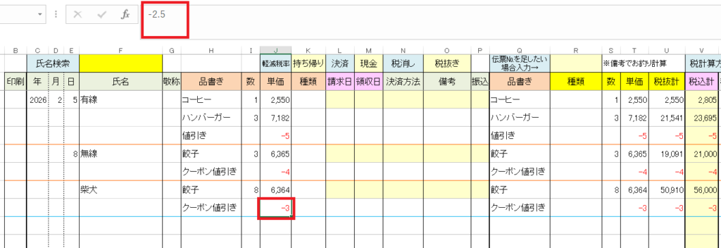 値引きの単価に-の数値を入力すると税抜計の値から値引きの数値が引かれます