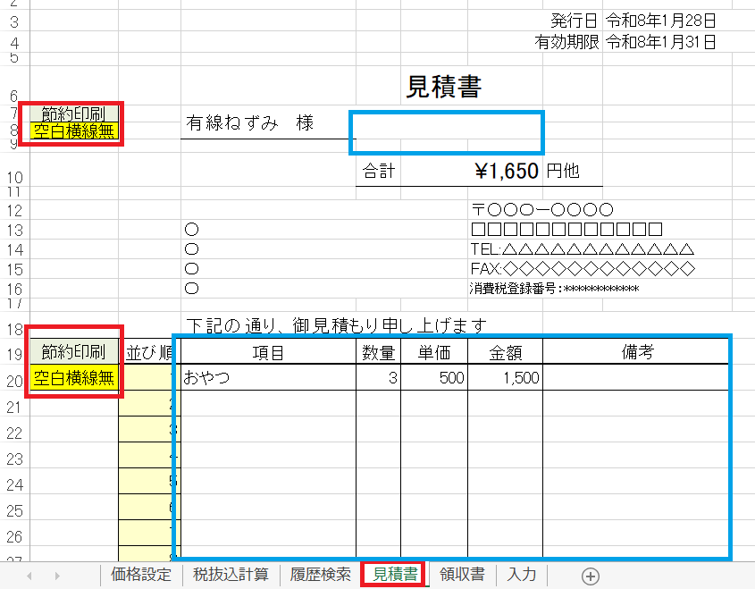 請求日や決済や計算結果から税抜き額を見たいとき、振込先の変更などを行うときは黄色いセルに入力します。