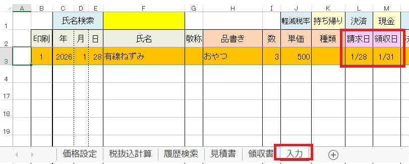 請求日・領収日が”なし”と入力した場合は領収書シートの領収日・請求日なしとなりの黄色いセルの値が表示されます。