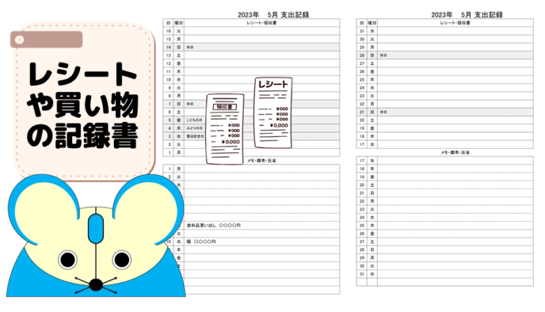 そこでカレンダーのエクセルシートを改造してレシートを張るための用紙を書いてみました。