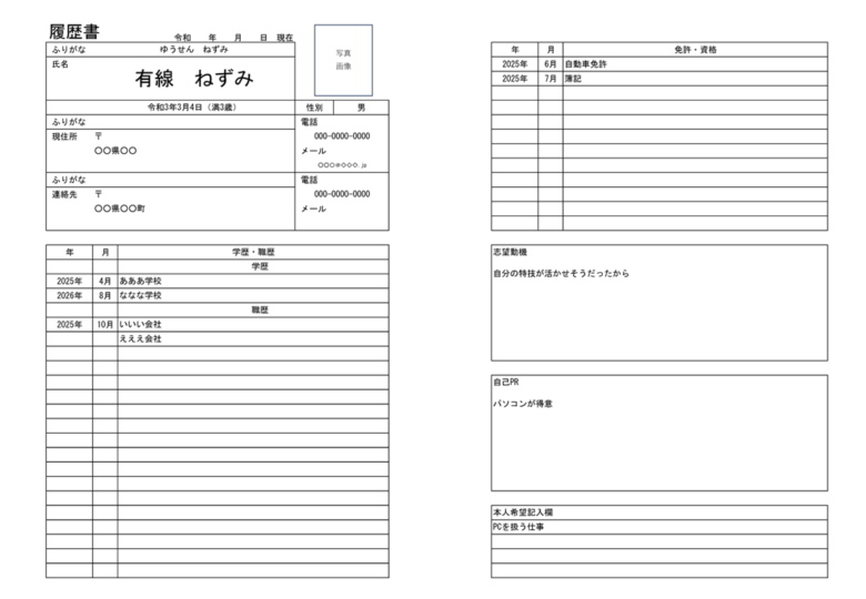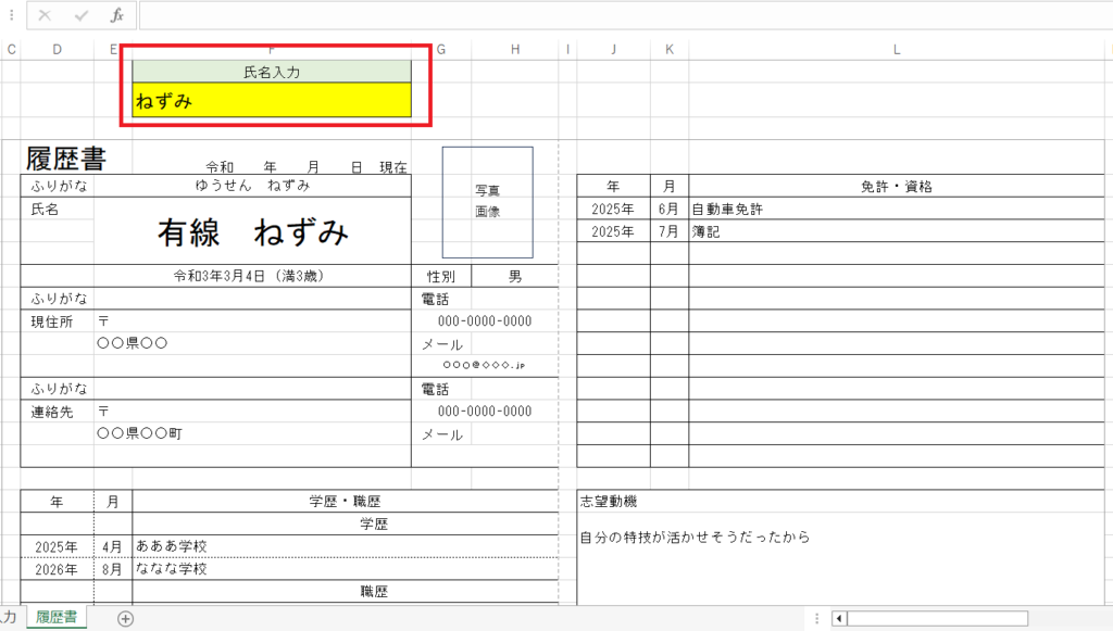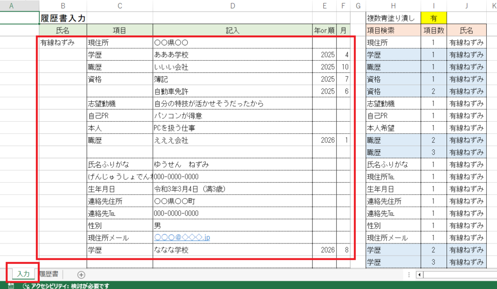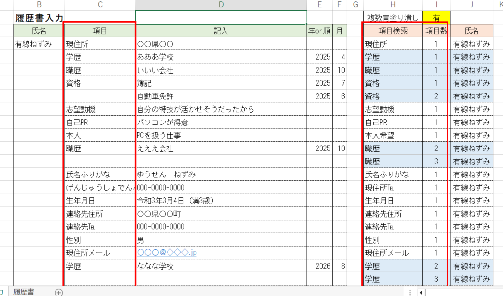 今回は複数人の履歴書とか作る場合に有利になる履歴書を考えて作成しました。
