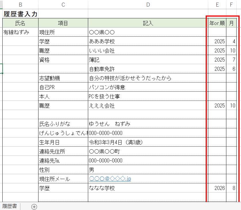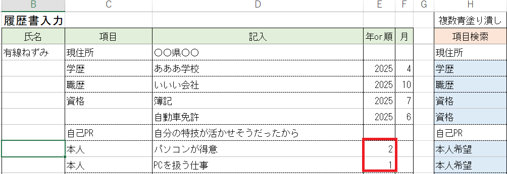 年数の列は履歴書の並び順が変えれる欄の場合は番号を変えて順を変えれます。