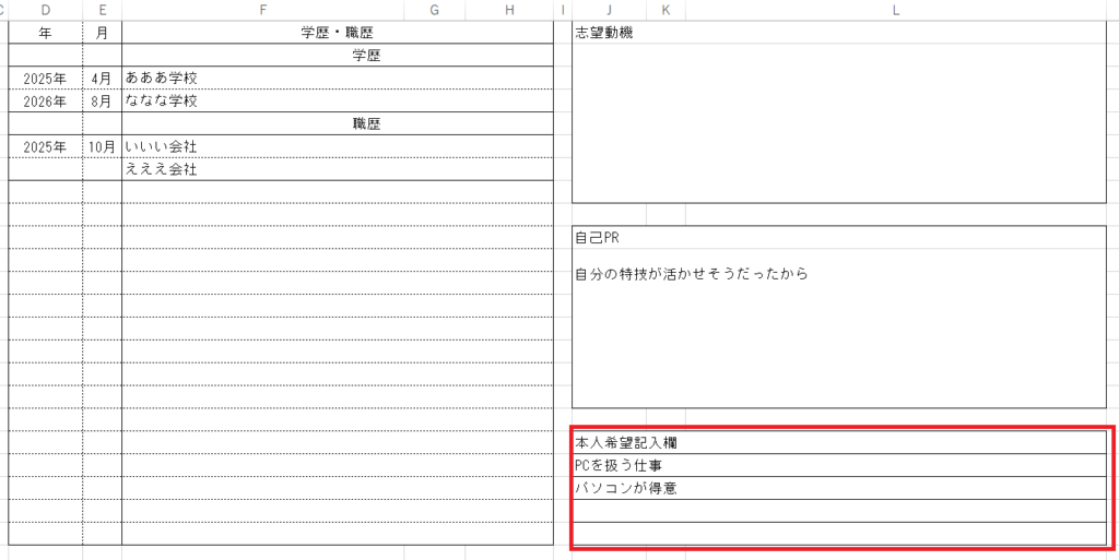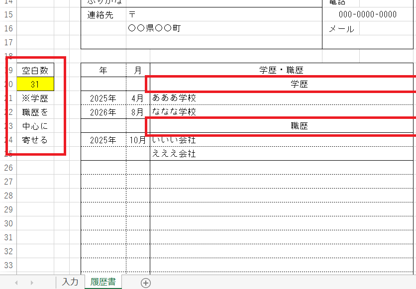 学歴・職歴を中心に寄せる調整は左端の空白数のセルの数値を変更して調整します。