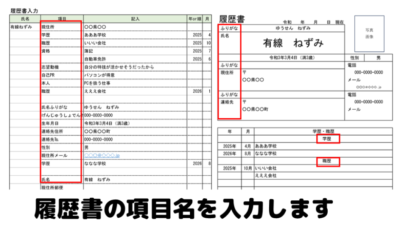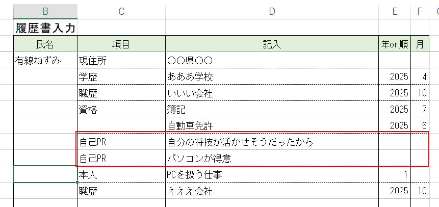 項目の列に履歴書で書く項目を入力します