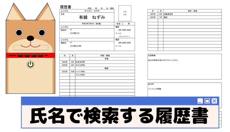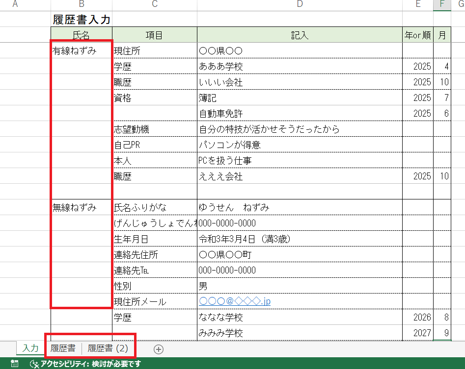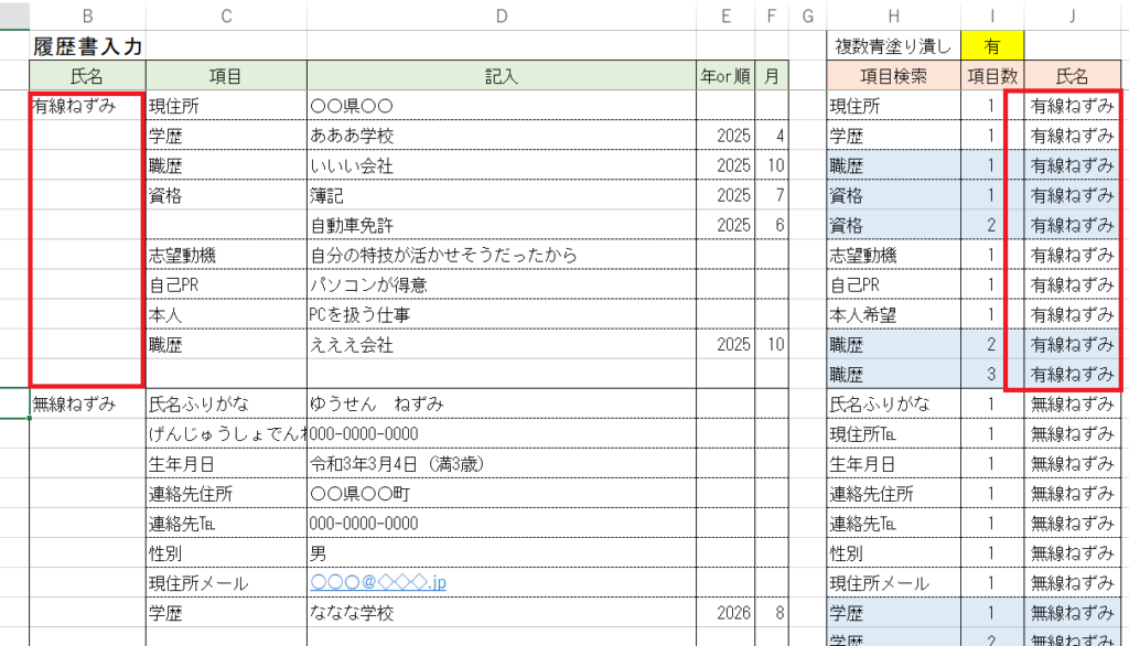 名前を複数人用意したり、履歴書を個人ごとに作ったり応用の幅があると思います。