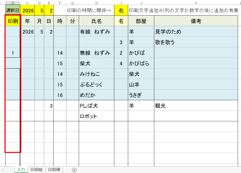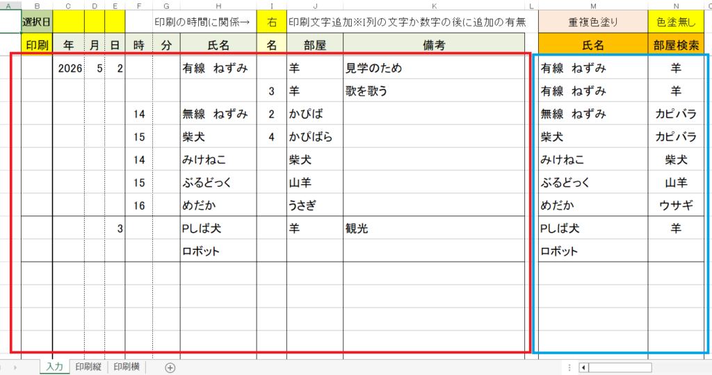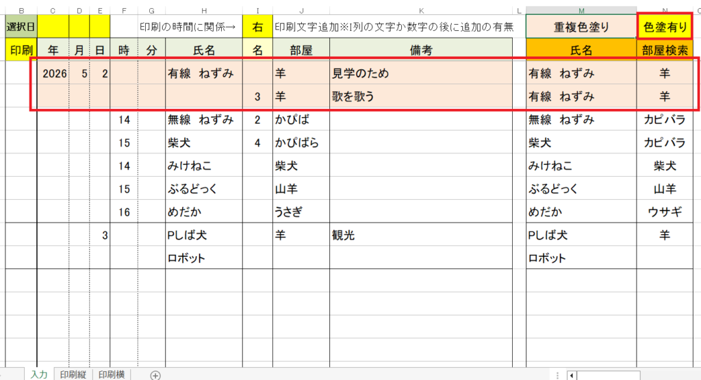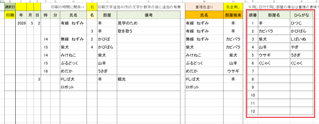 名前の空白や部屋名のひらがなや一部の文字でも青枠のオレンジのセルの列に反映されます。