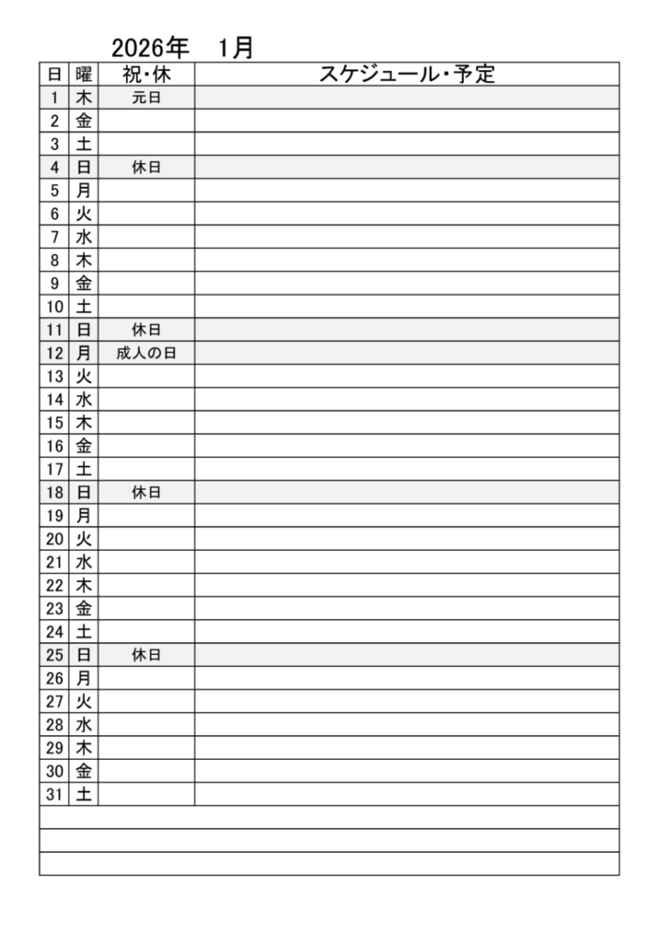 Excelで作ったスケジュールや行事などを書き込める表です。
